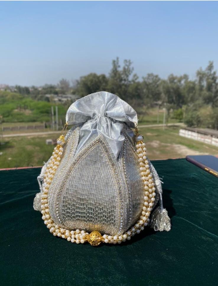 Elegant Silver Potli Bag – Bridal Handbag with Pearl Handle & Crystal Embellishments