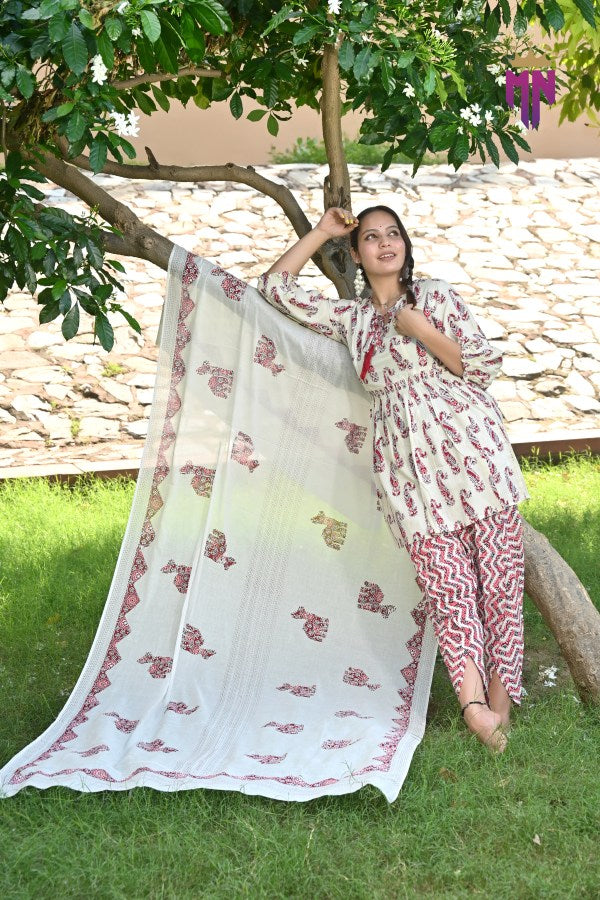 The kurta features an elegant design with traditional prints, paired with trendy zig-zag cotton pants for a modern touch. The soft cotton dupatta completes the look, making it a perfect outfit for casual outings, festive gatherings, office wear, or family functions.