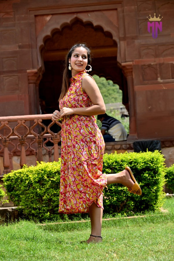 Elevate your summer style with the INDOSCART Women’s Pink Cotton Midi Dress. Crafted from lightweight and breathable cotton, this dress features a collared neckline with front button closure and stunning yellow-magenta floral prints that add a touch of vibrance and charm.